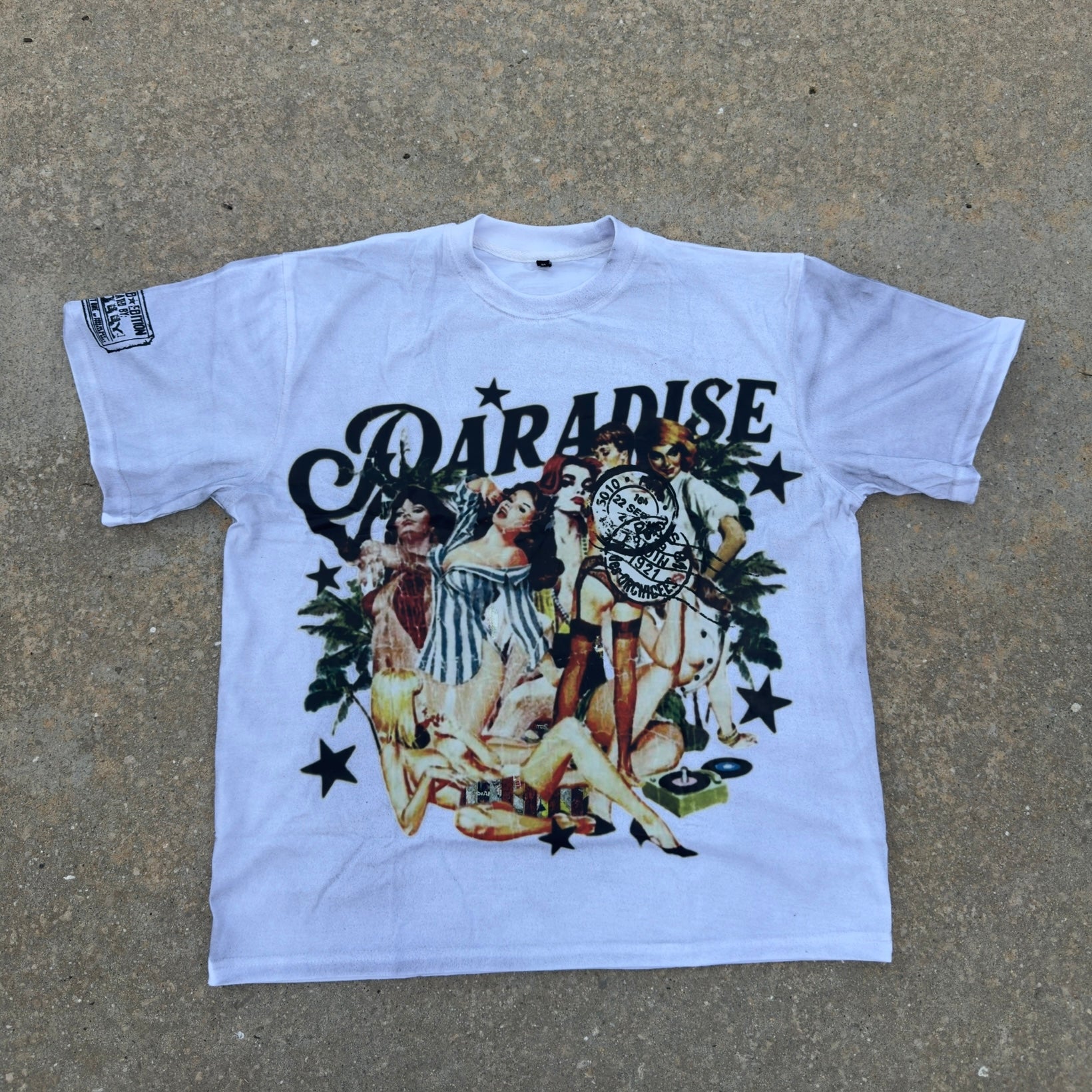 Step into retro summer vibes with this eye-catching oversized tee. Featuring a bold “PARADISE” graphic across the chest, this shirt showcases a vivid collage of vintage-style pin-up models, palm leaves, and playful star accents that bring a nostalgic yet edgy aesthetic. The relaxed, boxy fit offers a streetwear-inspired silhouette—perfect for layering or wearing on its own.